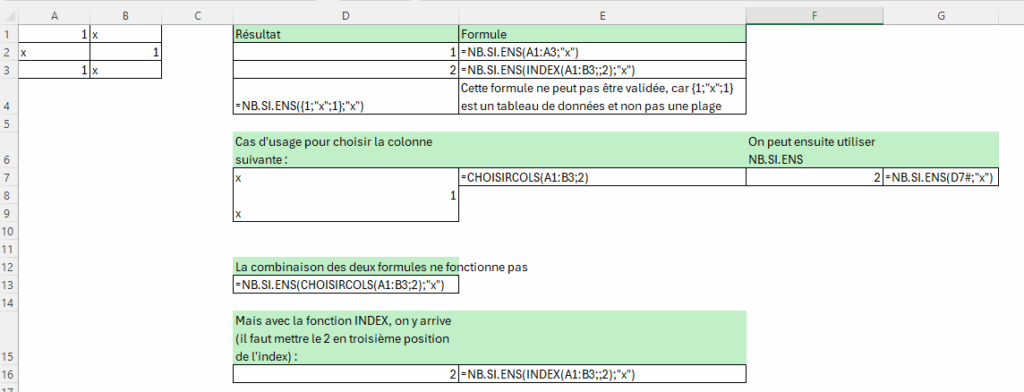 En effet, A1:A3 est une plage, alors que {1;"x";1} est un tableau de données. La fonction NB.SI.ENS n'accepte pas de tableaux de données comme premier argument.