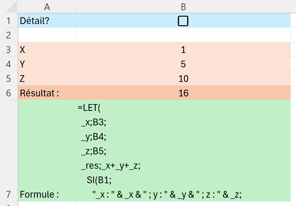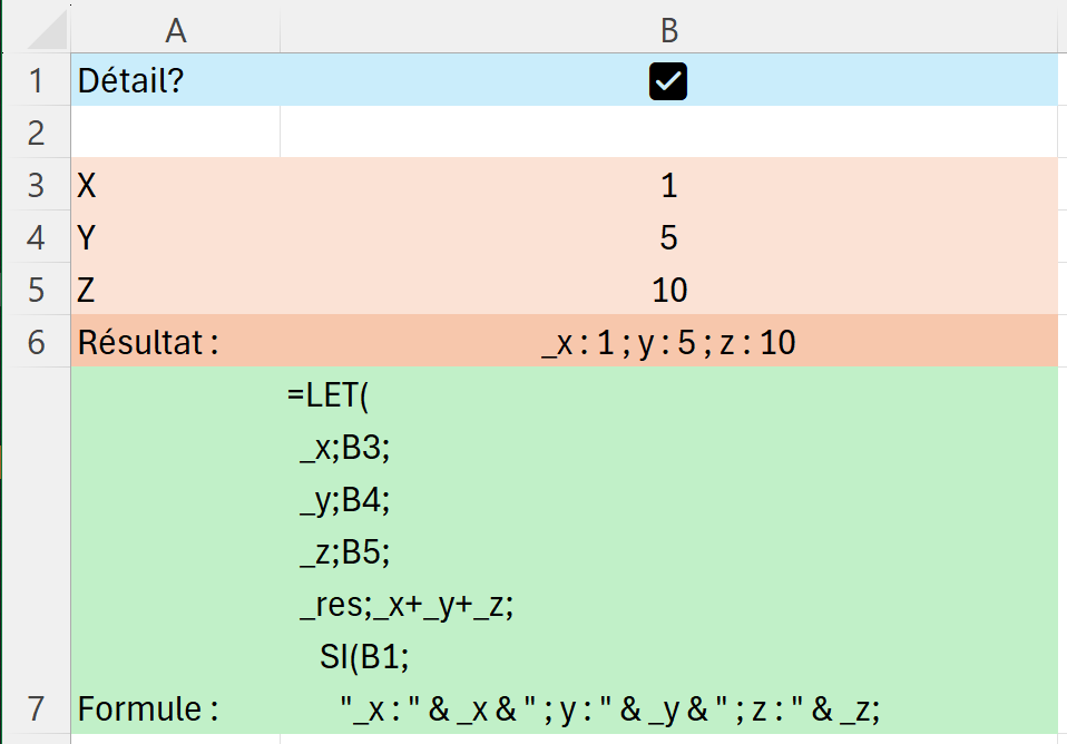 Quand vous utilisez une fonction LET, vous pouvez faire référence à des cellules contenant des cases à cocher pour passer d'un mode à un autre. Par exemple, passer d'un mode détail/dev/test, avec le détail des calculs, à un mode pro, avec uniquement le résultat.