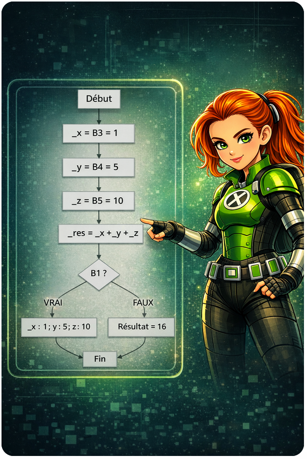 B1 contient une valeur VRAIE ou FAUSSE (case à cocher) qui permet donc soit d'afficher le résultat 16, soit le détail du calcul : _x : 1 ; y : 5 ; z : 10