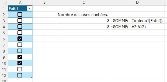 Formule : =SOMME(--Tableau1[Fait !]) ou bien =SOMME(--A2:A12)