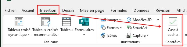 Rappel, pour ajouter des cases à cocher, on passe par Insertion, Cases à cocher