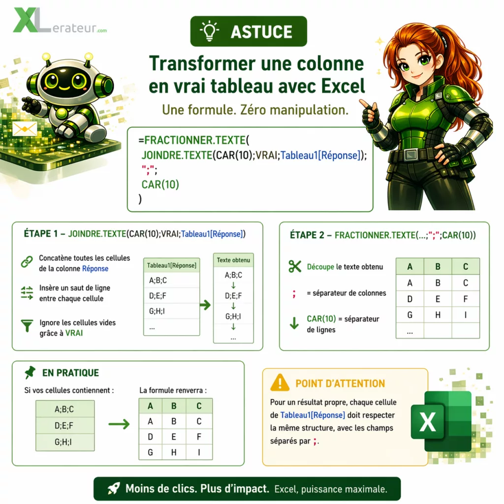 Cette formule sert à rassembler toutes les valeurs de Tableau1[Réponse], puis à les découper en un vrai tableau, en utilisant ; et CAR(10) comme séparateur :