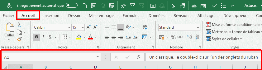 « Un classique, le double-clic sur l’un des onglets du ruban